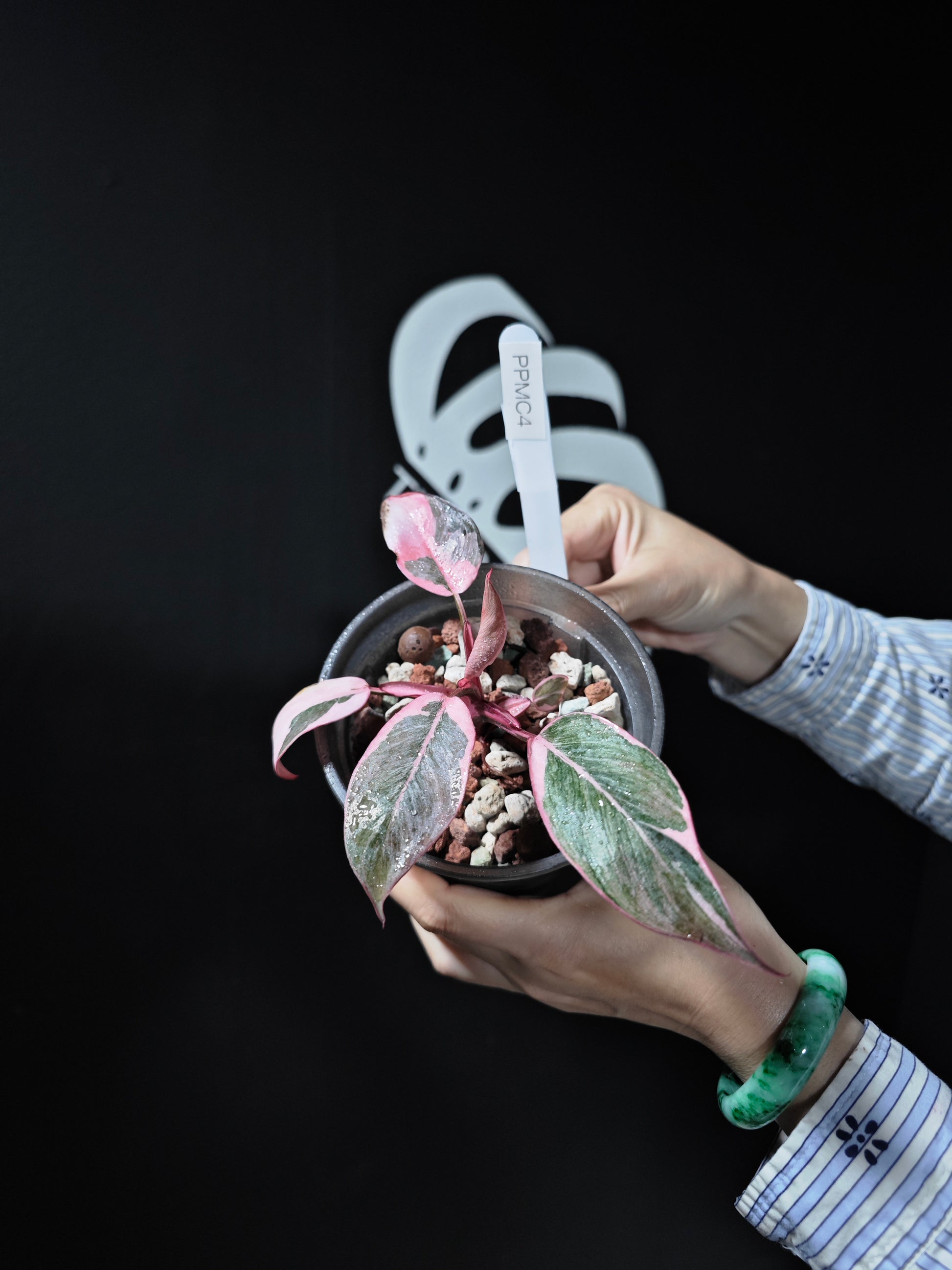 A rare and unique mutation of the Philodendron Pink Princess, this variety features a distinctive whitening effect that covers the original green tones of the leaves. This whitening creates a more muted, sophisticated “Morandi green” hue across the entire plant. In addition, the leaves are often surrounded by a white border, giving the plant a refined, elegant appearance with soft contrasts. This mutation offers a subtle yet striking variation compared to the classic Pink Princess, making it a highly coveted addition to plant collections.
